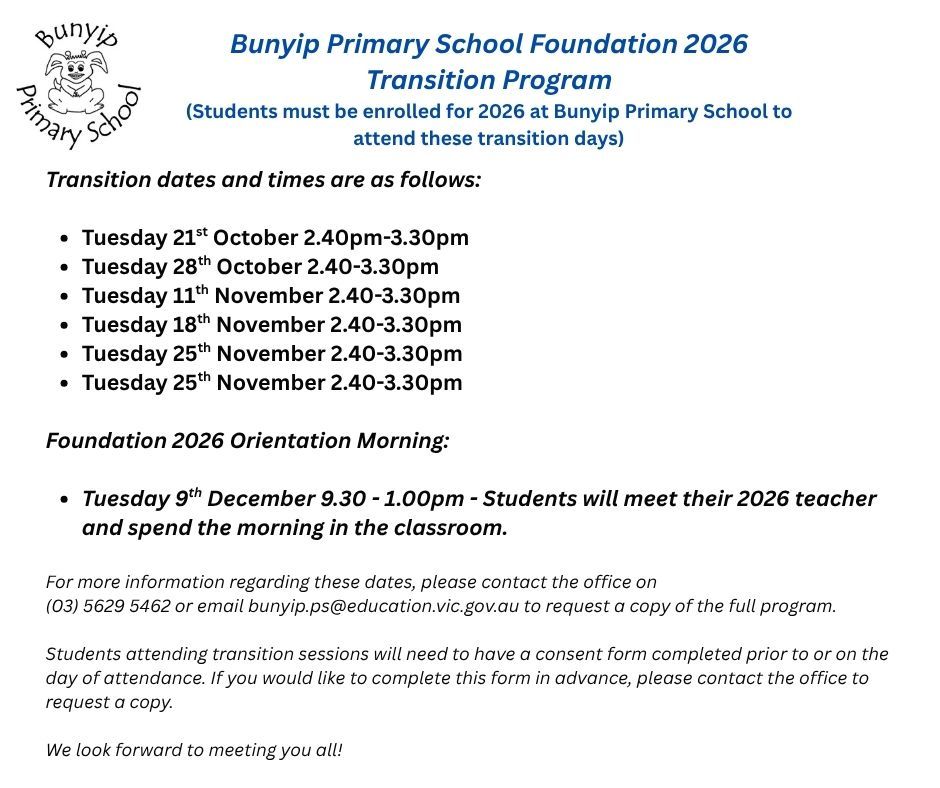 All enrolment forms are available via contacting the office on 03 5629 5462 or emailing bunyip.ps@education.vic.gov.au .